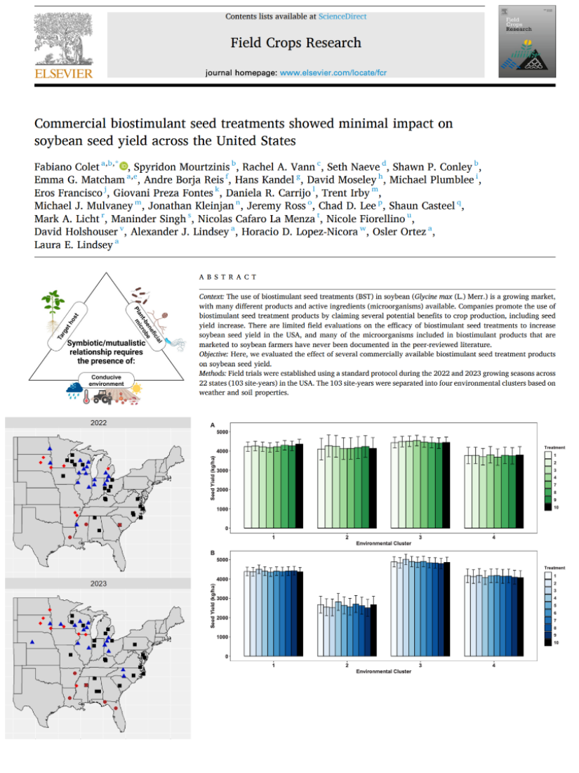 Commercial biostimulant seed treatments showed minimal impact on soybean seed yield across the United States