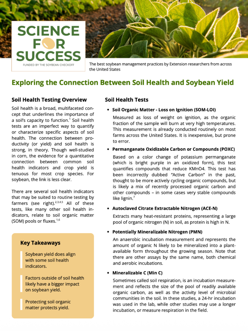 Soil health is a broad, multifaceted concept that underlines the importance of a soil’s capacity to function. Soil health tests are an imperfect way to quantify or characterize specific aspects of soil health. The connection between productivity (or yield) and soil health is strong, in theory. Though well-studied in corn, ...