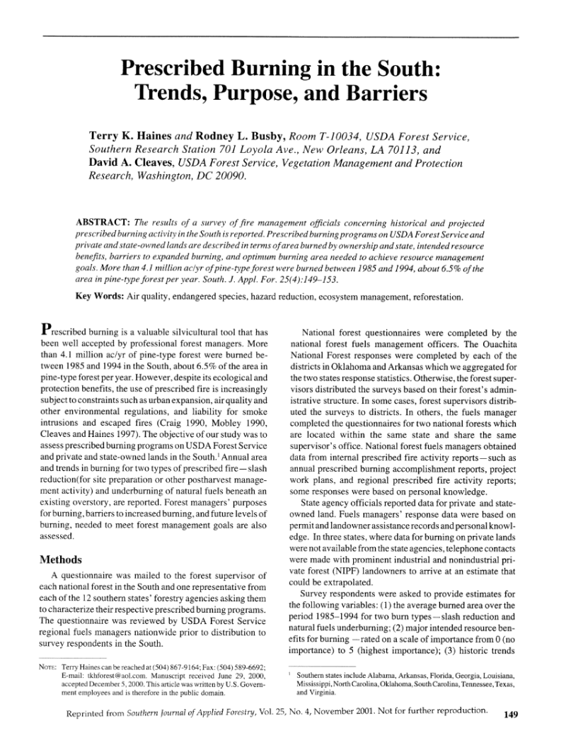 Prescribed Burning in the South: Trends, Purpose, and Barriers