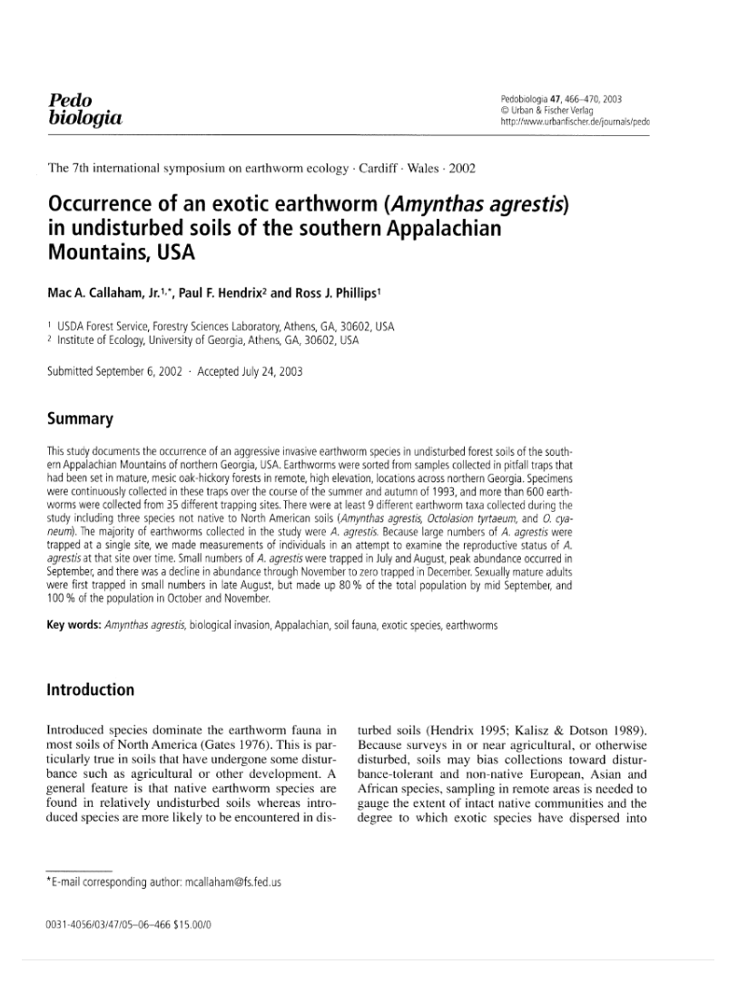 Occurrence of an exotic earthworm (Amynthas agrestis) in undisturbed soils of the southern Appalachian Mountains, USA