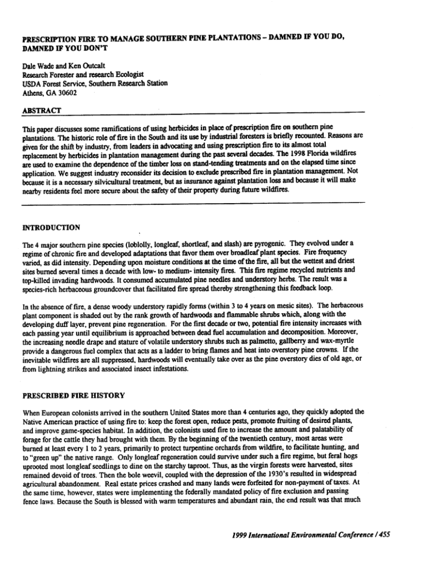 Prescription Fire to Manage Southern Pine Plantations - Damned If You Do, Damned If You Don't