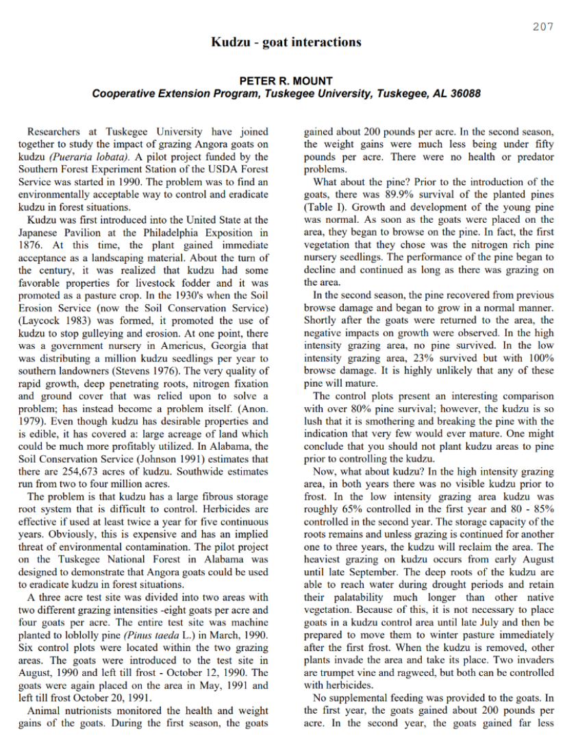 Researchers at Tuskegee University have joined together to study the impact of grazing Angora goats on kudzu (Pueraria lobata). A pilot project funded by the Southern Forest Experiment Station of the USDA Forest Service was started in 1990. The problem was to find an environmentally acceptable way to control and ...