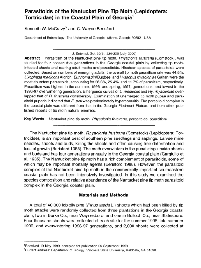 The Nantucket pine tip moth, Rhyacionia frustrana (Comstock), an important pest of intensively managed loblolly pine, Pinus taeda L., was first noted in the scientific literature in 1879. This pest gained notoriety with the establishment of loblolly pine monocultures throughout the southeastern United States during the 1950s. Current intensive forest ...