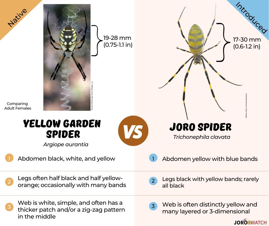 A graphic comparing the identification characteristics of joro spider (Trichonephila clavata) and the yellow garden spiderĀ (Argiope aurantia)