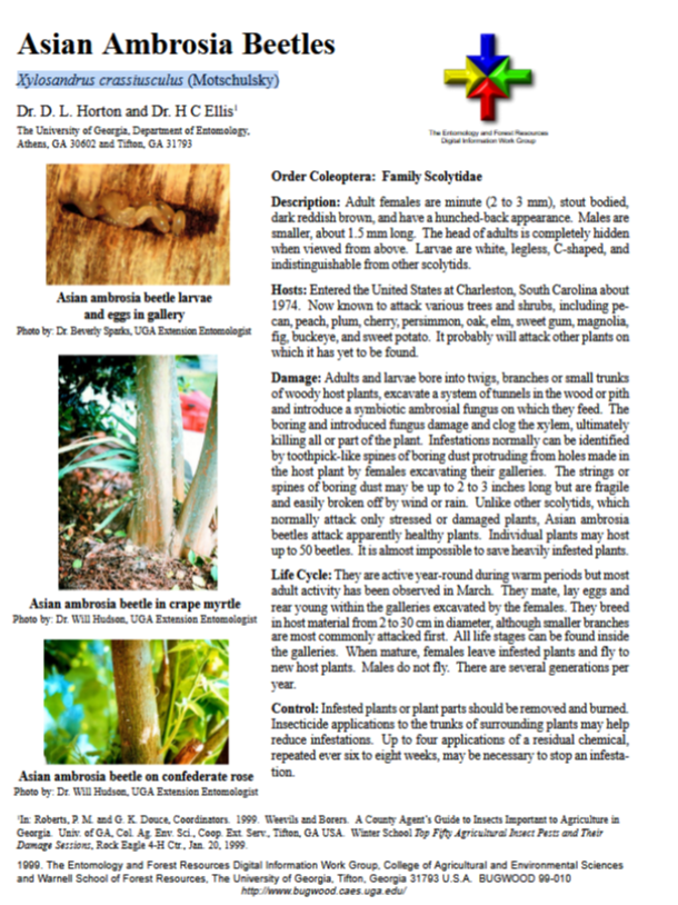 Adult females are very small beetles, only 2–3 mm long, with stout bodies, a dark reddish?brown color, and a hunched?backed appearance. Males are even smaller, about 1.5 mm in length. In adults, the head is completely concealed when viewed from above. The larvae are white, legless, C?shaped grubs that closely resemble those of other scolytid beetles.