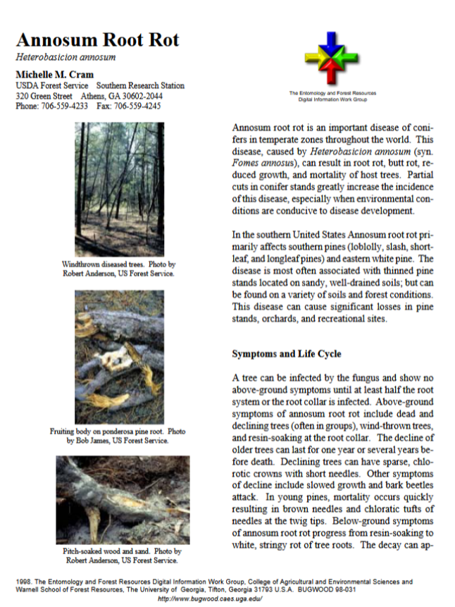Annosum root rot is an important disease of conifers in temperate regions worldwide. Caused by Heterobasidion annosum (formerly Fomes annosus), it can lead to root rot, butt rot, reduced growth, and even tree mortality. The occurrence of this disease increases substantially after partial cuts in conifer stands, especially when environmental conditions favor its development.
