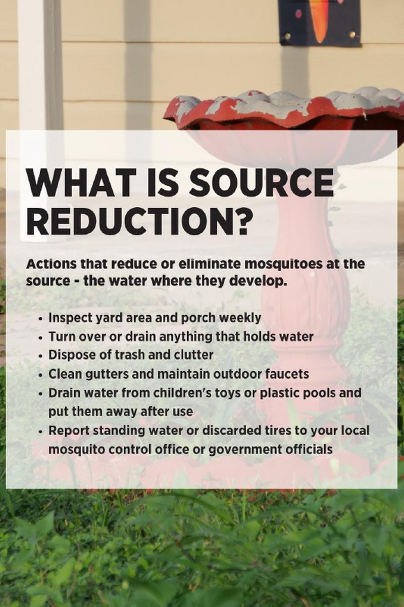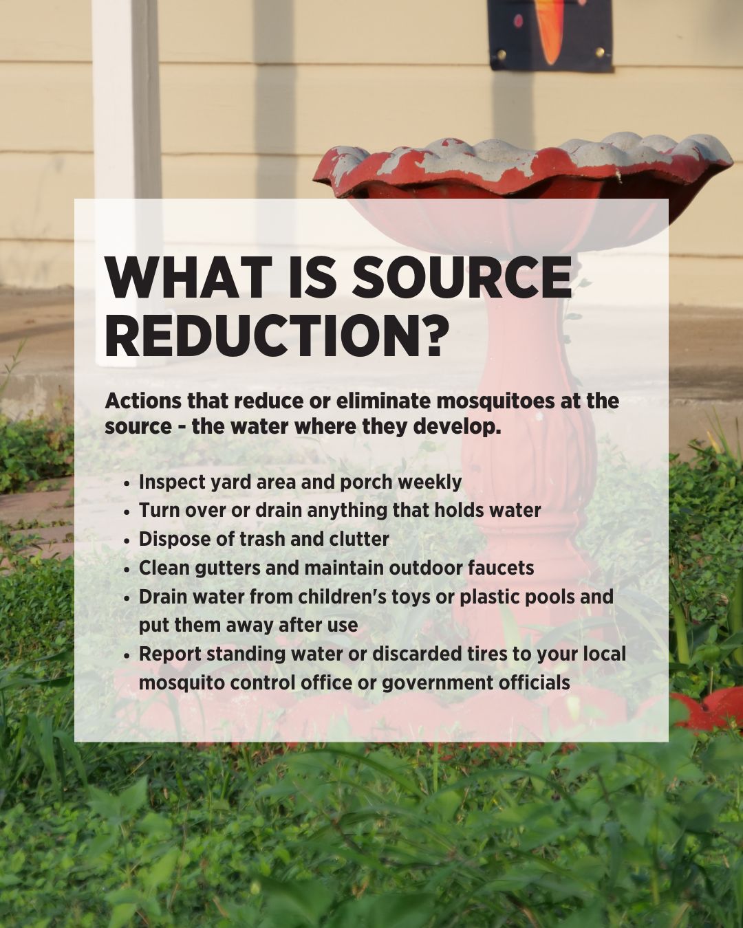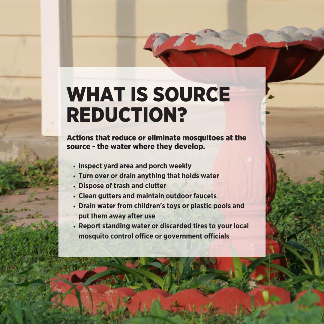 Suggested Post Text: Source reduction is one of the most effective ways to control mosquitoes. By regularly checking outdoor areas around the home and eliminating standing water, you can stop mosquitoes before they become adults. Simple habits like turning over containers and toys, managing clutter, maintaining gutters and outdoor fixtures, and properly storing items that collect water can help protect your home and community from mosquitoes.