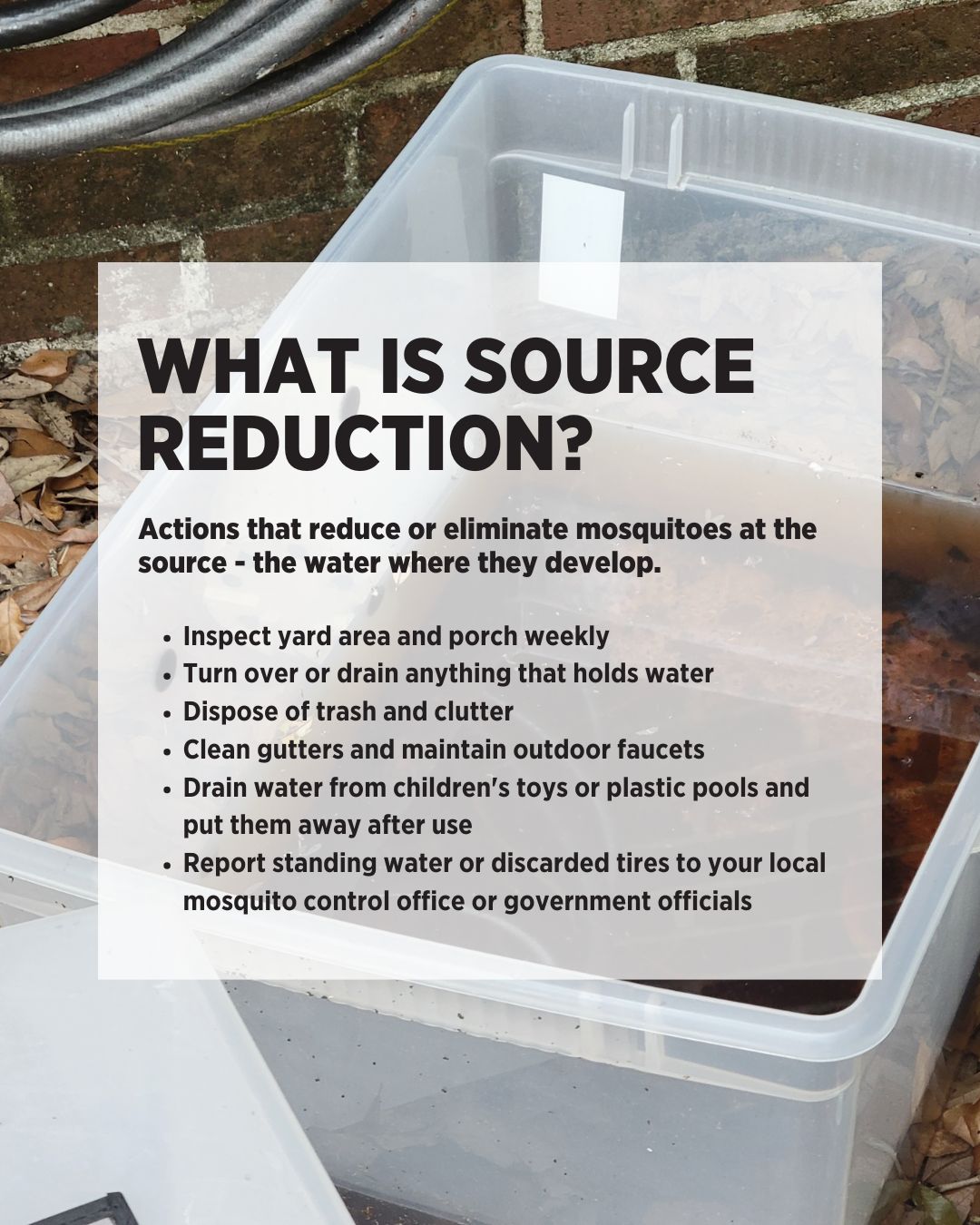 Suggested Post Text: Source reduction is one of the most effective ways to control mosquitoes. By regularly checking outdoor areas around the home and eliminating standing water, you can stop mosquitoes before they become adults. Simple habits like turning over containers and toys, managing clutter, maintaining gutters and outdoor fixtures, and properly storing items that collect water can help protect your home and community from mosquitoes.