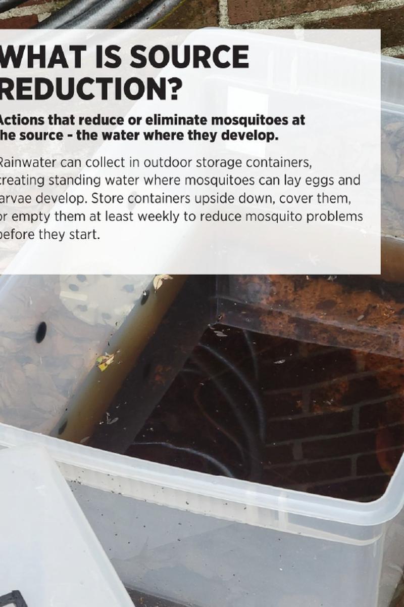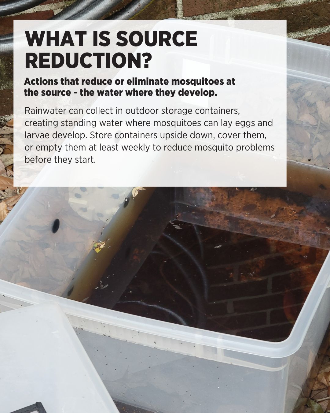 Suggested Post Text: Source Reduction Starts at Home. Storage containers left outdoors can collect rainwater, especially when lids are not secure or watertight, or when containers are left uncovered. Emptying containers, storing them upside down, or storing them in covered locations like a garage or storage shed helps prevent standing water and reduces mosquito problems around your home and neighborhood.